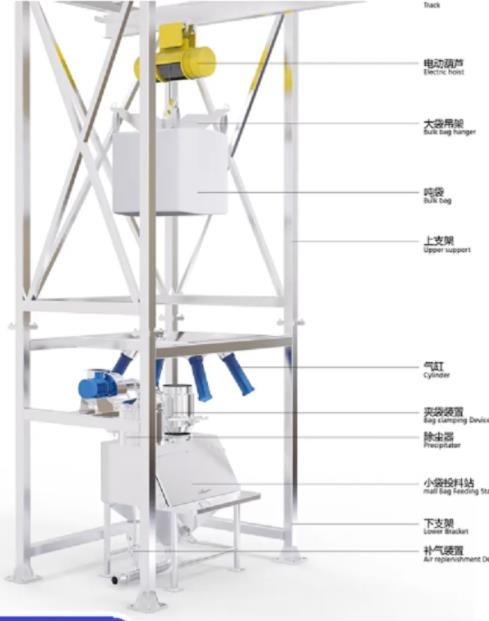 1、設備支架及護板;2、電動葫蘆;3、噸袋吊架;4、夾袋裝置;5、拍打、振動、磁選裝置;6、緩沖料倉;