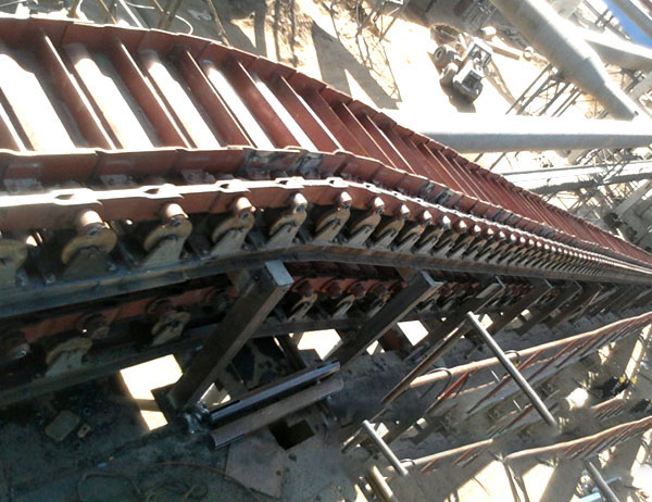 鏈板式輸送機鏈板部分由牽引鏈和槽板組成。牽引鏈采用耐沖擊、運行平穩(wěn)可靠的片式牽引鏈,內鏈片中間裝有滾輪,在軌道上滾動,以減少摩擦阻力和磨損。槽板用螺栓與牽引鏈緊固在一起。